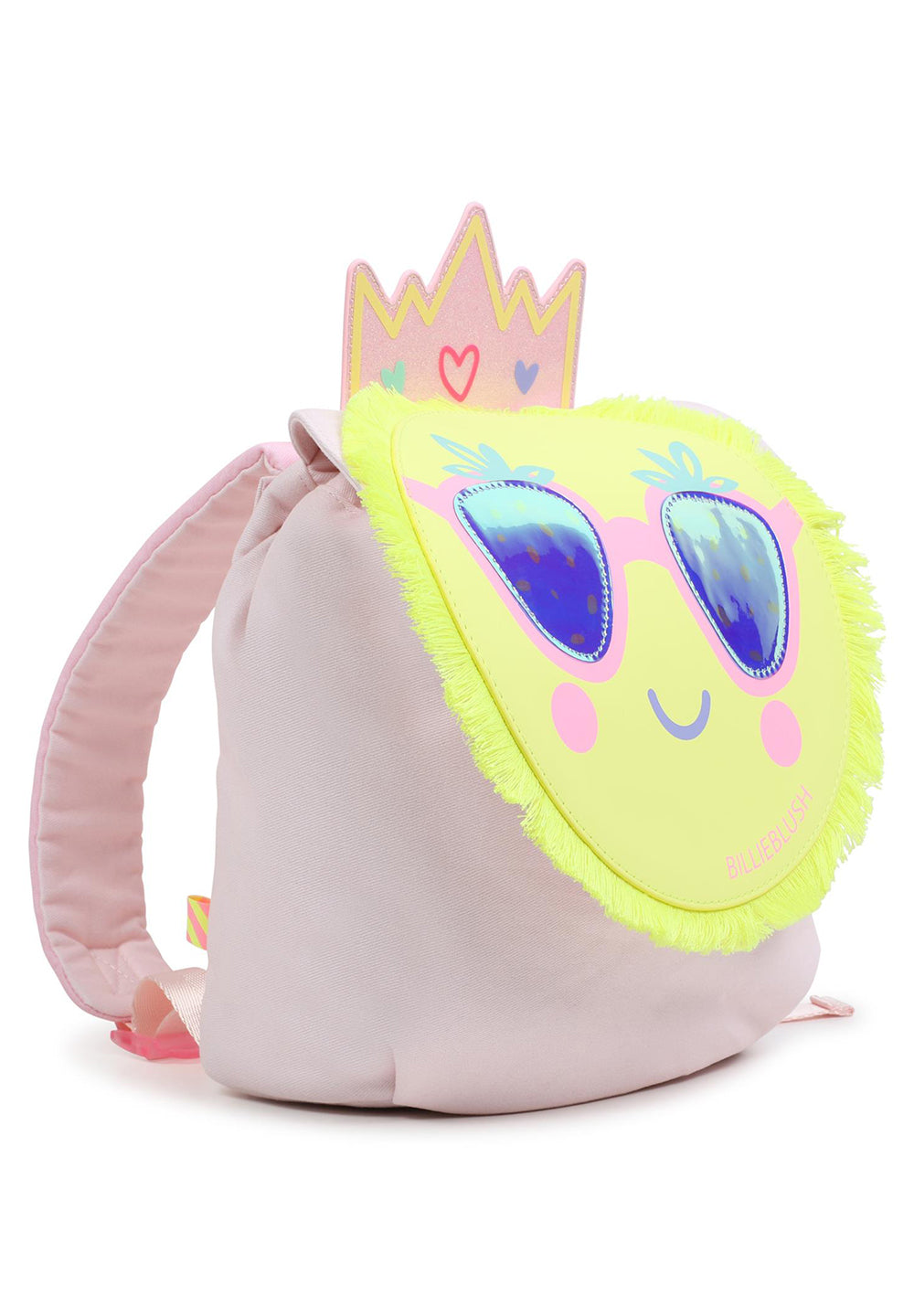 Illustrazione di fantasia sul davanti (stampa sole + pvc glitterato + frange. Corona in tessuto spalmato glitterato).