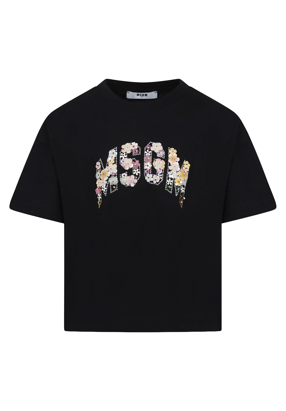 ART. S5MSJGTH105 T-shirt decorata con logo MSGM, strass e fiori applicati sulla parte anteriore, colore nero, cotone